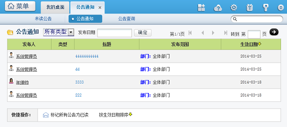 1)在 个人事务->公告通知 菜单下可以查看自己有权限的查看的公告,只能查看生效状态的公告,如图所示: