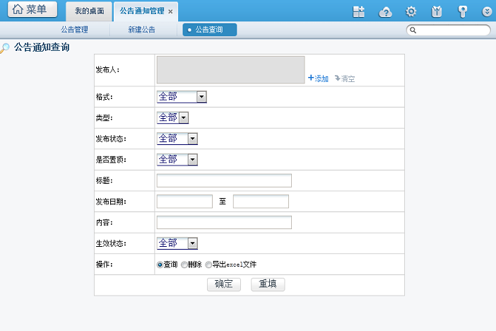 在行政办公->公告通知管理中的公告查询中,可以通过按照自己设置的条件进行公告通知的查询,并将符合条件的公告进行删除、导出。如图所示: