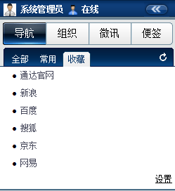 6)页面收藏夹:“页面收藏夹”类似浏览器的收藏的快捷方式,首先在控制面板中添加收藏地址,然后在经典主题下点开“收藏”(梦幻灵动主题不显示,具体效果见结尾处),单击收藏的记录即可打开相应的网站,如图所示: