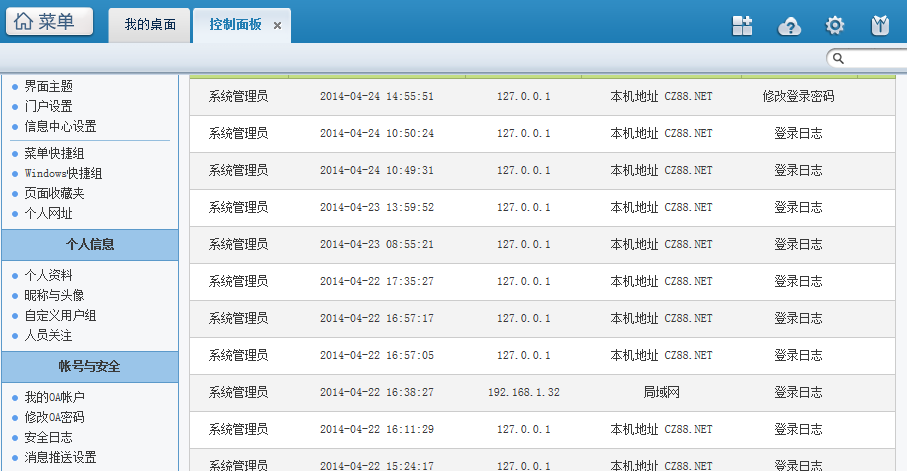 14)安全日志:记录自己登录OA系统的相关信息,如时间、IP等信息,如图所示: