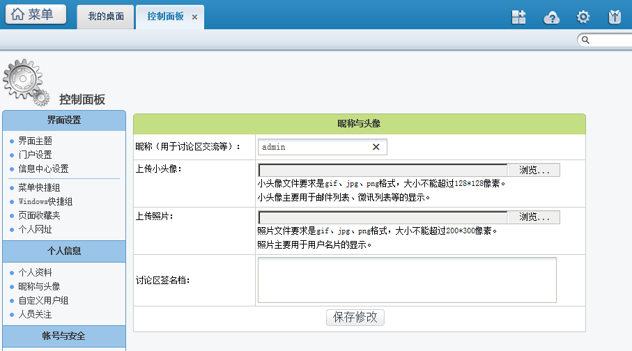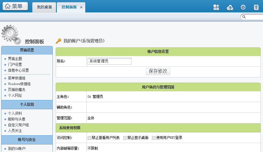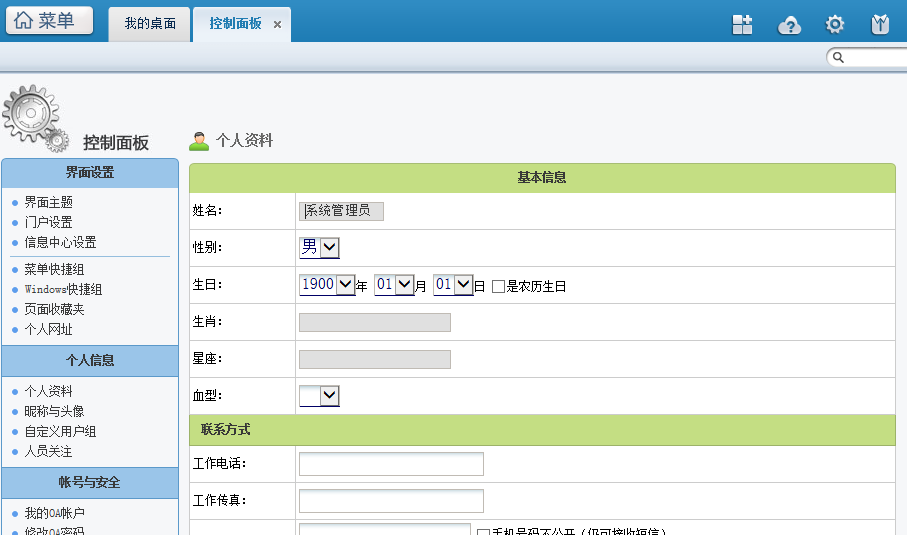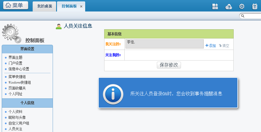 1、个人信息主要针对用户登录OA系统后在个人事务->控制面板中填写的个人资料信息。与人事管理下的人事档案是有区别的。