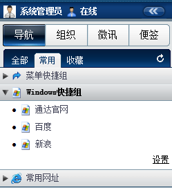 5)Windows快捷组:“Windows快捷组”类似浏览器的收藏的快捷方式,windows快捷组首先在“控制面板”中设置好,然后在windows分类中点击“通达官网”,浏览器就会打开通达官方网站,如果是第一次使用此功能,那么,浏览器需要加载一个插件(通达OA windows快捷组),此功能目前只在经典主题显示(具体效果见结尾处),梦幻灵动主题不显示,如图所示: