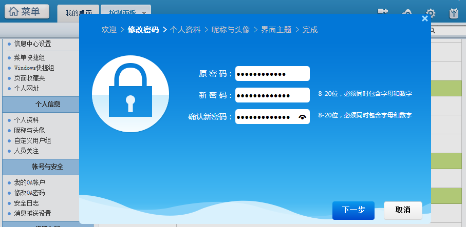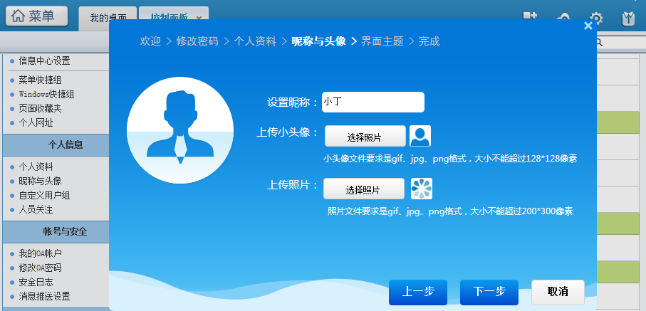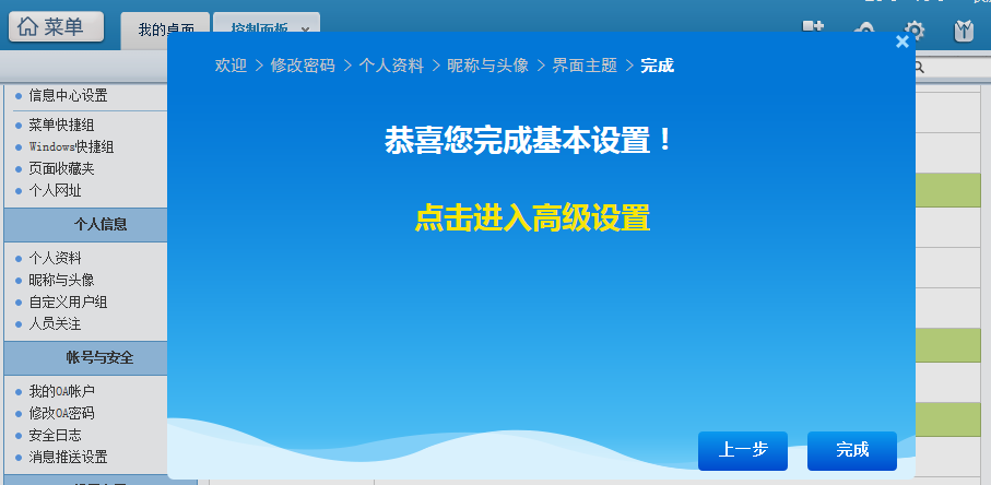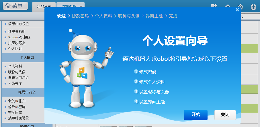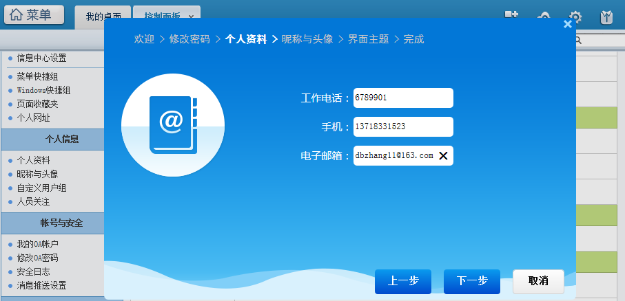 16)个人设置向导:此功能主要针对刚刚接触我们OA系统的用户,指导用户一些简单的设置,比如设置OA密码、联系方式等,详细信息如图所示: