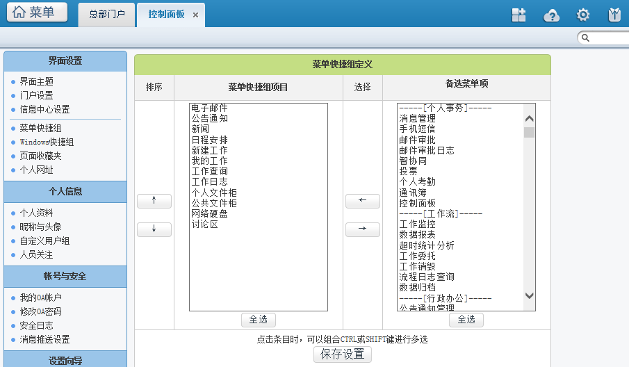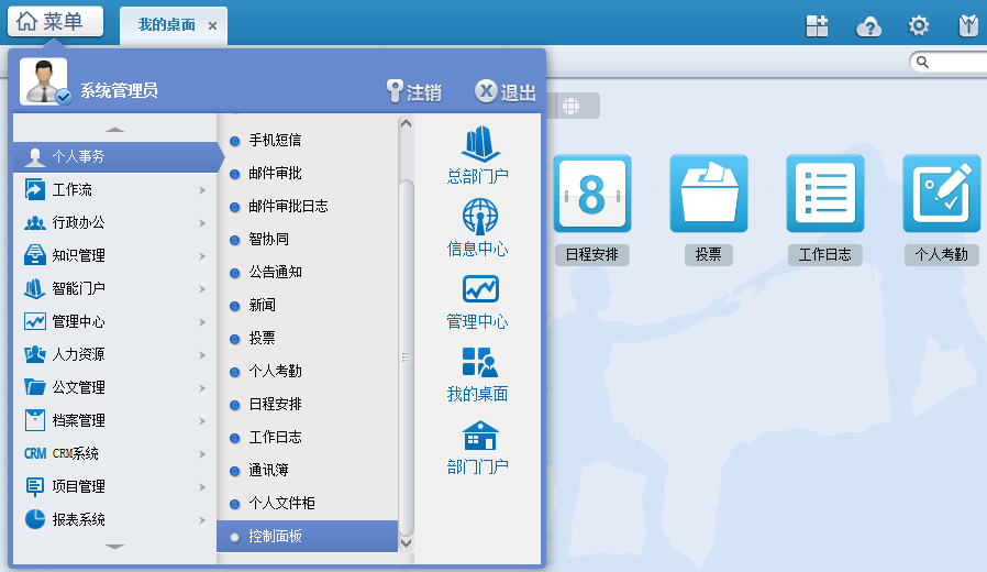2、用户登录系统后点击个人事务->控制面板 ,如图所示: