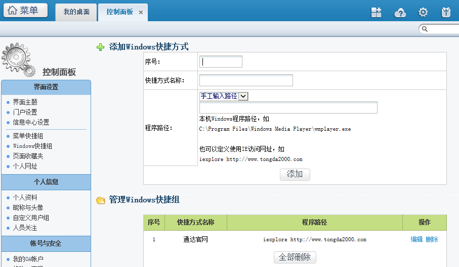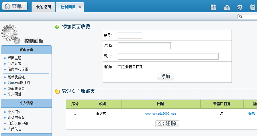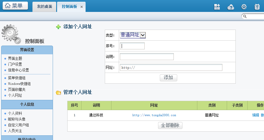 7)个人网址:“个人网址”主要收藏自己常用的网站地址,快捷进入相关网站,该功能在经典主题下显示(具体效果见结尾处)。如图所示:
