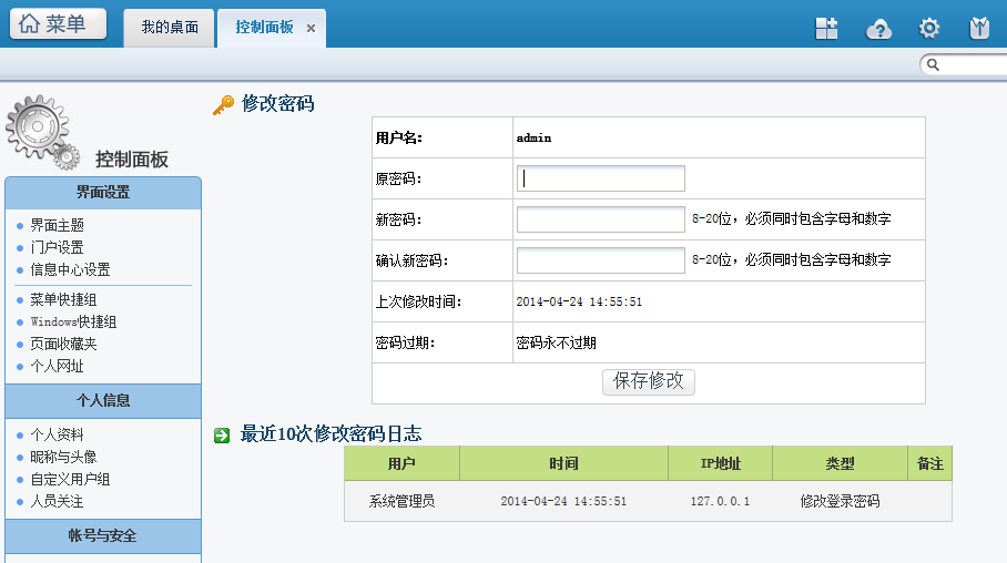 13)修改OA密码:此功能用来修改自己登录OA的密码,同时系统会记录修改密码的相关记录,包括时间修改时间、修改IP等,如图所示: