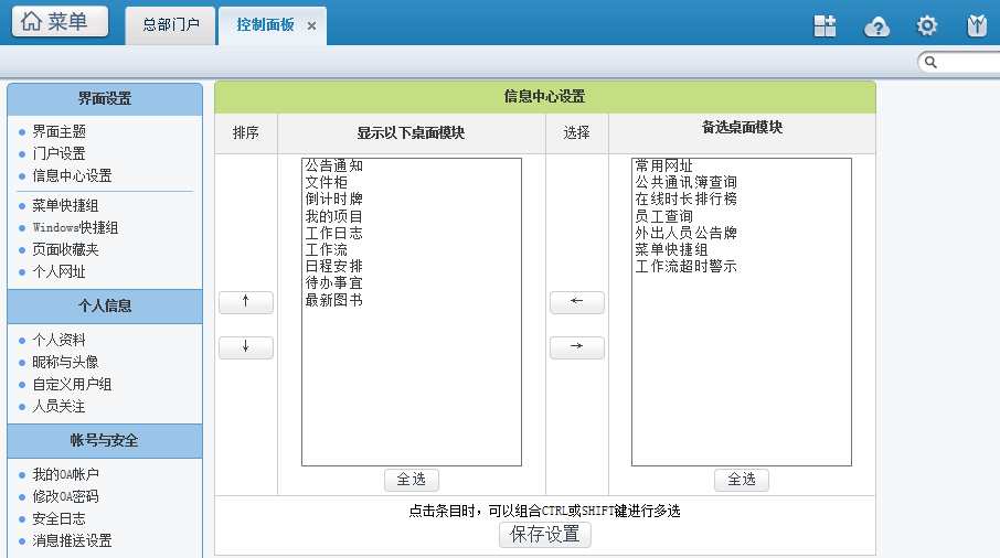 2)门户设置:“门户设置”中可根据自己的习惯选择适合自己的门户,各门户中内容在“智能门户”或者“管理中心”设置,同时,这是设置的门户只会在梦幻灵动主题下显示,经典主题不显示门户信息。如图所示: