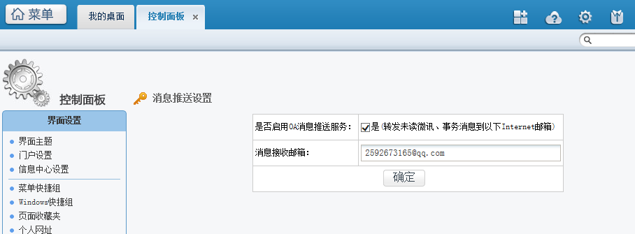 15)消息推送设置:“消息推送设置”实现未读微讯,事务提醒转发到Internet邮箱,前提是集成了Internet邮箱才能正常使用此功能(Internet邮箱的集成请见“如何设置和使用外部邮件”),如图所示: