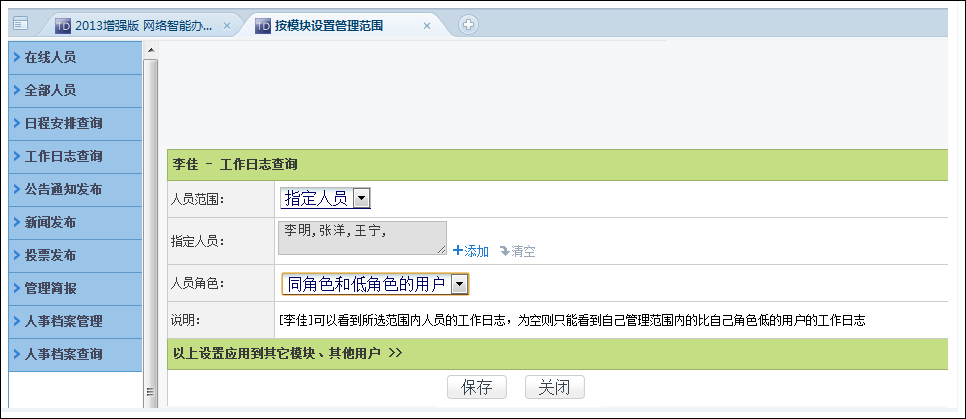 2、打开按模块设置管理范围->工作日志查询页面,人员范围选择“指定人员”(李明、张洋、王宁),角色范围可以选择为“同角色和低角色的用户”。如图所示: