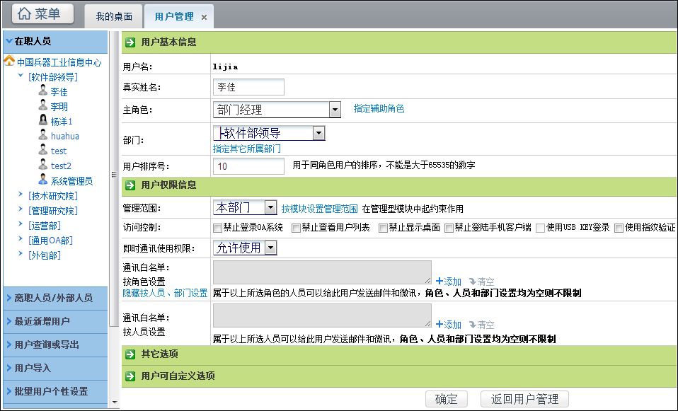 1、OA管理员登录系统,找到指定的人员,为其设置按模块设置管理范围,操作如下:点击菜单->系统管理->组织机构设置->用户管理->用户编辑,以李佳为例。如图所示: