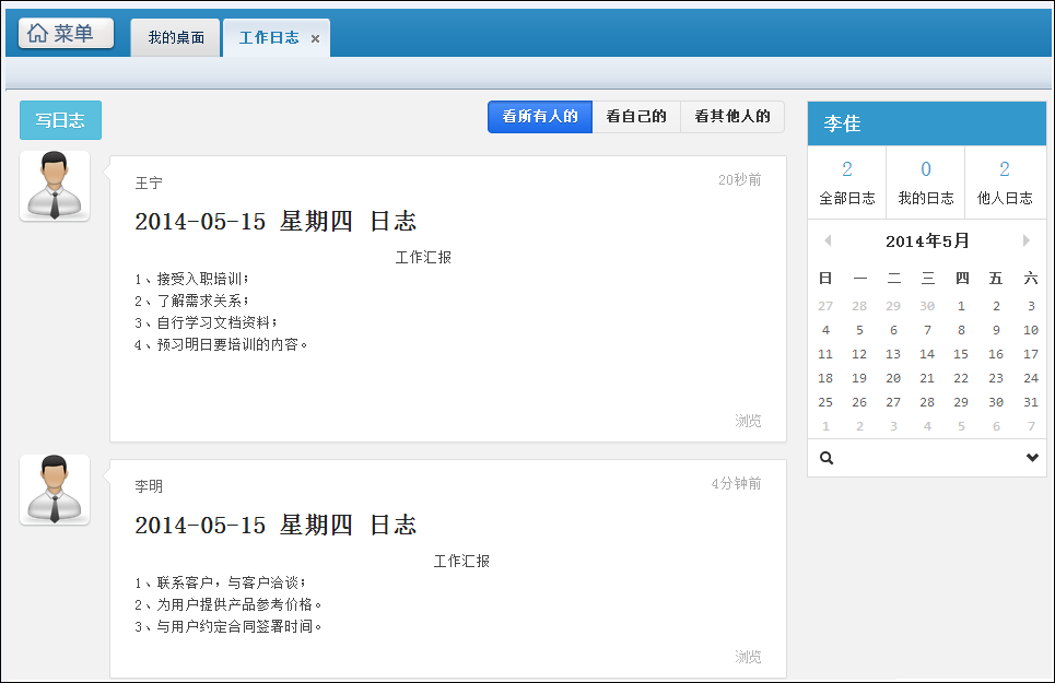 3、被指定的人员的按模块设置管理范围,工作日志查询权限设置好,就可以菜单->个人事务->工作日志模块,查看指定人员的工作日志了。以用户李佳为例,能够查询到李明和王宁的日志。如图所示: