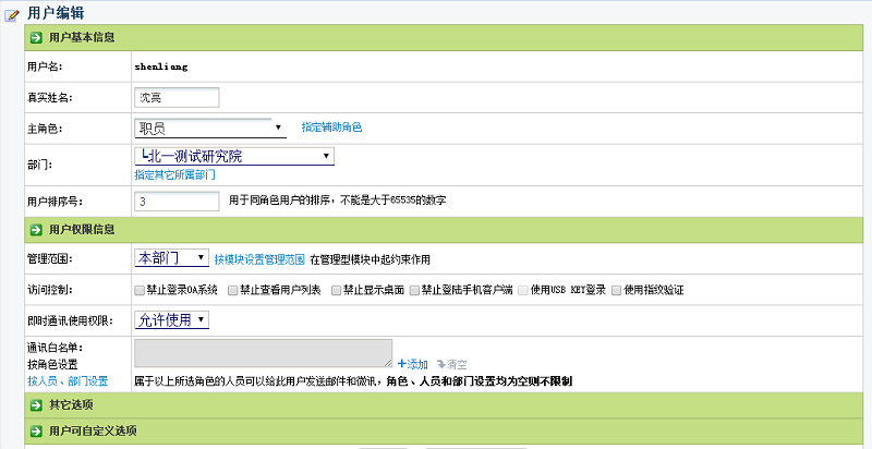 2、用户管理范围由OA管理员在系统管理->组织机构设置->用户管理中指定。用户的角色序号,由OA管理员在系统管理->组织机构设置->角色与权限管理中指定。如图所示: