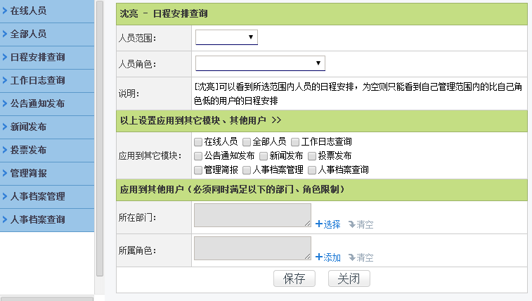 1、默认情况下用户可以查询本角色管理范围内的,同时角色序号靠后的用户的日程安排,可以查看其日程安排中的工作事务部分,但无法看到个人事务部分。