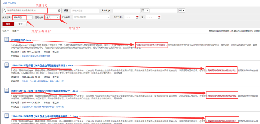 举例:一份毕业设计中有如下语句:“随着网络规模和复杂程度的增加”,你想知道在其他学生的毕业设计文档中是否也存在与之完全一样的语句,你就可以检索这个语句,如果其他毕业设计文档也存在同样的语句,则全文检索功能将会找出哪些文档也存在这样的语句,据此可判断其他学生是否为抄袭。建议指导老师从学生上传上来的毕业设计文档多摘取一些语句进行检索,以提高查重精确度。