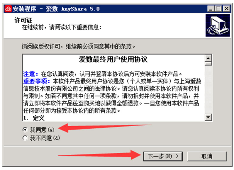 (2)在“许可证”窗口中选择“我同意”,单击“下一步”