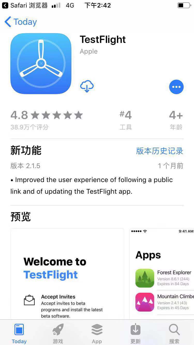 4. 按照提示第1步,需要先去app store安装testflight(很重要)