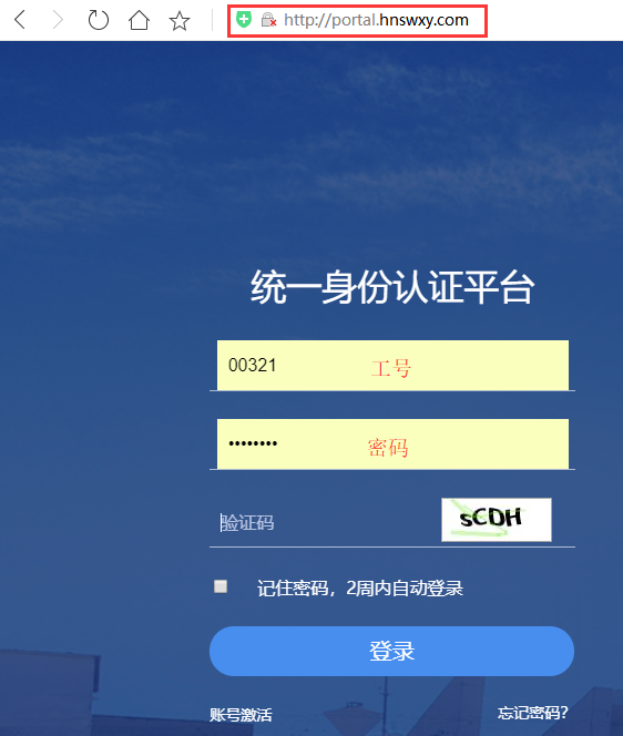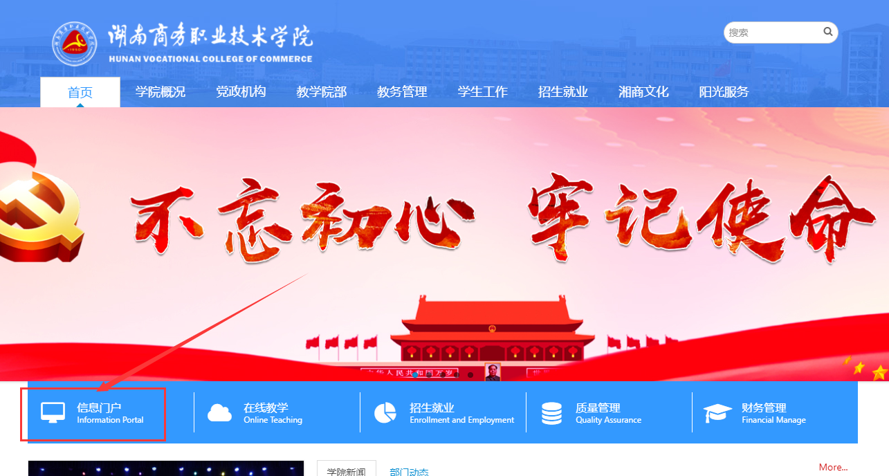 通过学院官网(http://www.hnswxy.com)首页上的 “信息门户”链接打开。如下图所示: