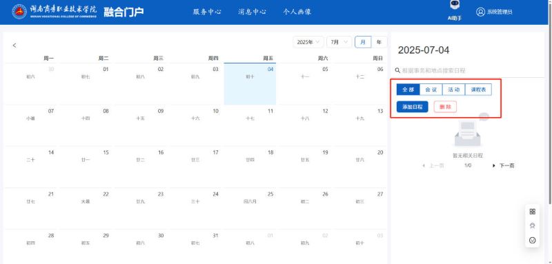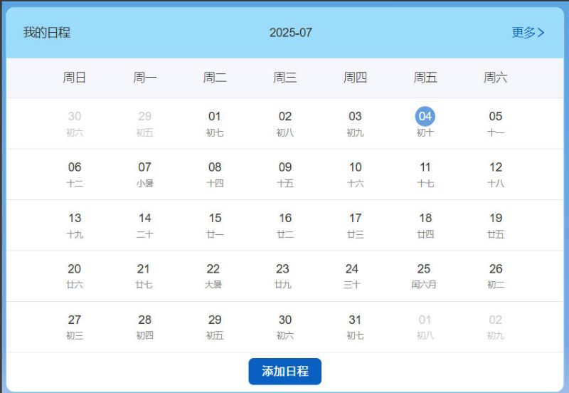 在“我的日程”??橹?,用户可以查看日程信息,点击“更多”,可以查看日程的详细信息;点击“添加日程”,填写相关信息之后可以新增日程。