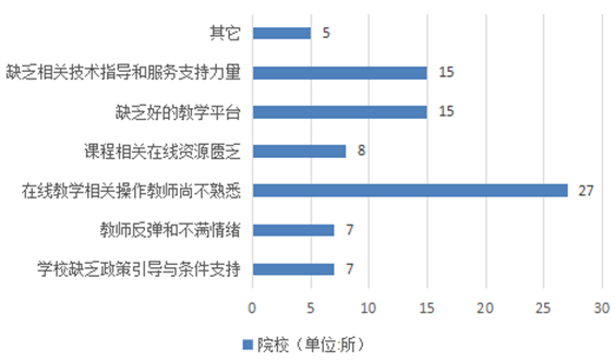 对于疫情期间学??乖谙呓萄Т嬖诘闹疃嗬?,大多数高校认为主要表现在教师对在线教学相关操作尚不熟悉;另外学校缺乏好的教学平台与相关技术指导、服务支持力量也是重要因素;同时课程相关在线资源匮乏也是在线教学开展困难的部分原因,具体情况如图13所示。
