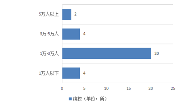 在参与调研的高校中,开展在线教学活动高校的学生规模大部分集中在1-3万人之间,详情如图2所示。其中达到5万人以上的2所;3万-5万人的共4所;1万-3万人的20所,占比最多;1万以下的高校共有4所。