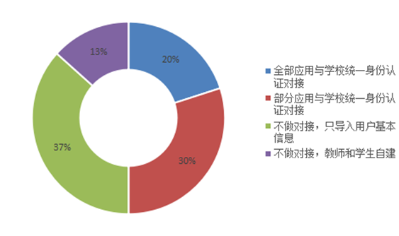 学校在使用云端教学平台或直播系统时是否与学校统一身份进行认证对接,各校的情况不尽相同,如图14所示。37%的高校不做对接,只导入用户基本信息;30%的高校采用部分应用与学校统一身份认证对接;还有20%的高校采用全部应用与学校统一身份认证;13%的高校不做对接,采用教师和学生自建。