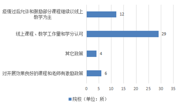 针对疫情期间教师开展的在线教学活动,大多数高校采用了线上课程、教学工作量、学分认可等多种政策支持措施,具体情况如图10所示。97%的高校实施了线上课程、教学工作量和学分认可政策支持措施;40%的高校将在疫情结束后允许和鼓励部分课程以线上教学为主;还有20%的高?;菇钥剐Ч己玫目纬毯屠鲜Σ扇〖だ?;另外有13%的高校选择其他政策措施。