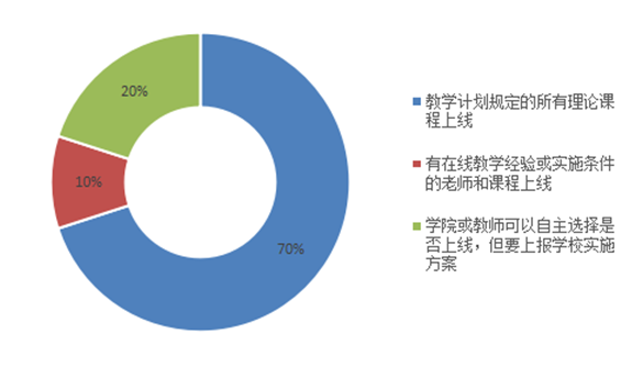 对于学生授课的课程涵盖要求情况如图4所示。70%的高校要求有教学计划规定的所有理论课程均需上线教学,可以看出大部分高校均采取了此措施;20%高校的学院或教师可以自主选择是否上线,但要上报学校相应的实施方案;也有10%的高校提出有在线教学经验或实施条件的老师和课程可以线上教学。