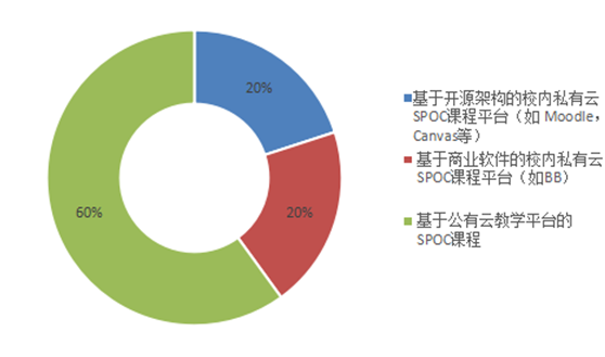 使用SPOC在线课程的高校中,拟采用的平台情况如图7所示。60%的高校均采用基于公有云教学平台的SPOC课程;20%的高校选择基于开源架构的校内私有云SPOC课程平台(如Moodle、Canvas等);还有20%的高校选择基于商业软件的校内私有云SPOC课程平台(如BB)。