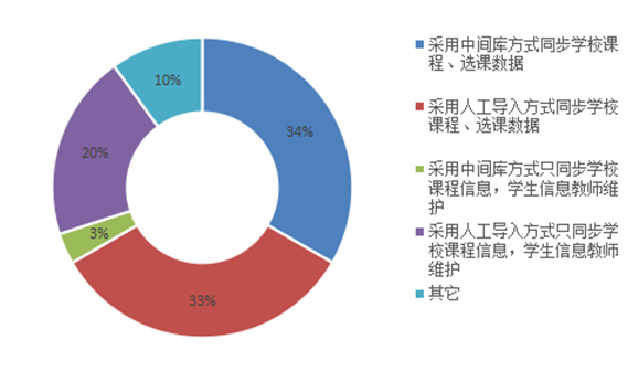 学校在使用云端应用时是否同步学??纬?、选课数据的情况也各有不同,详情如图15所示。34%的高校选择采用中间库方式同步学??纬?、选课数据;33%的高校采用人工导入方式同步学??纬?、选课数据;20%的高校采用人工导入方式只同步学??纬绦畔?,学生信息由教师维护;只有3%的高校采用中间库方式只同步学??纬绦畔?,学生信息教师维护。