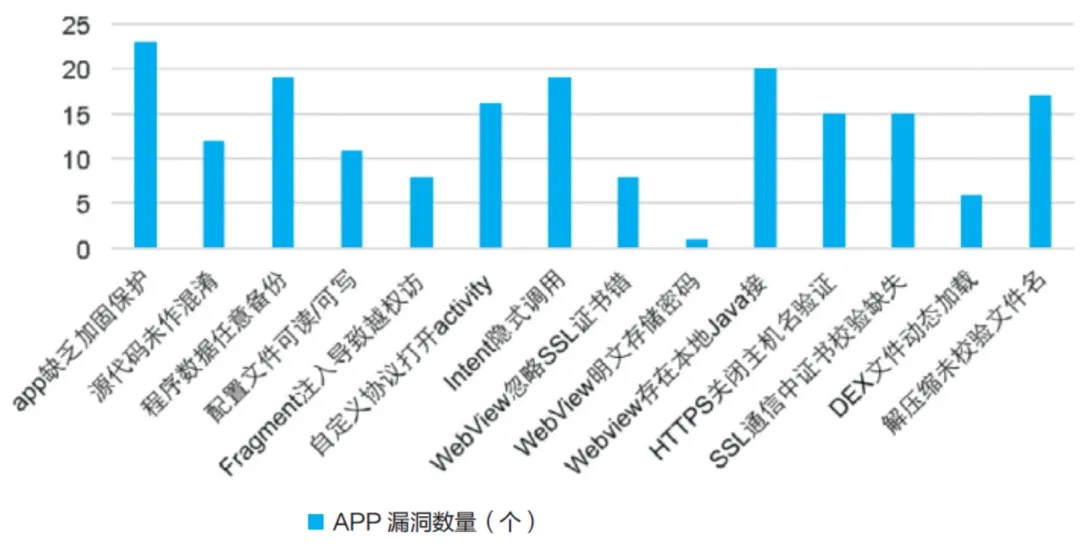 调查结果显示,出现0次或1次问题的APP数量仅为5个,涉及到的问题包含不限于缺乏加固?;?、源代码未混淆、WebView明文存储等。这些问题可以总结为程序源代码安全、本地数据存储安全、通信数据传输安全、恶意防范攻击能力等,具体如图1所示。
