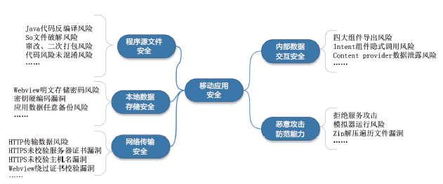 在校园APP出现的诸多安全隐患中,程序源文件安全、本地数据存储安全、网络传输安全、内部数据交互安全、恶意攻击防范能力等,从多方面展示校园APP可能存在的安全风险,如图2所示。