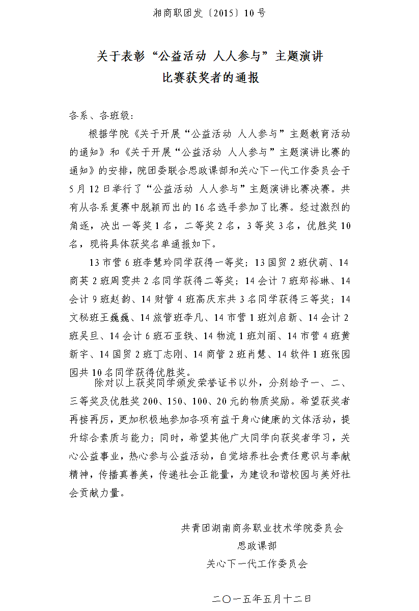 为引导大学生积极参与公益活动、培养学生的社会责任意识和志愿服务精神,根据学院《关于组织开展“公益活动 人人参与”主题教育活动的通知》的安排,思政课部、院团委和关工委于3-5月举行了“公益活动 人人参与”主题演讲比赛活动。