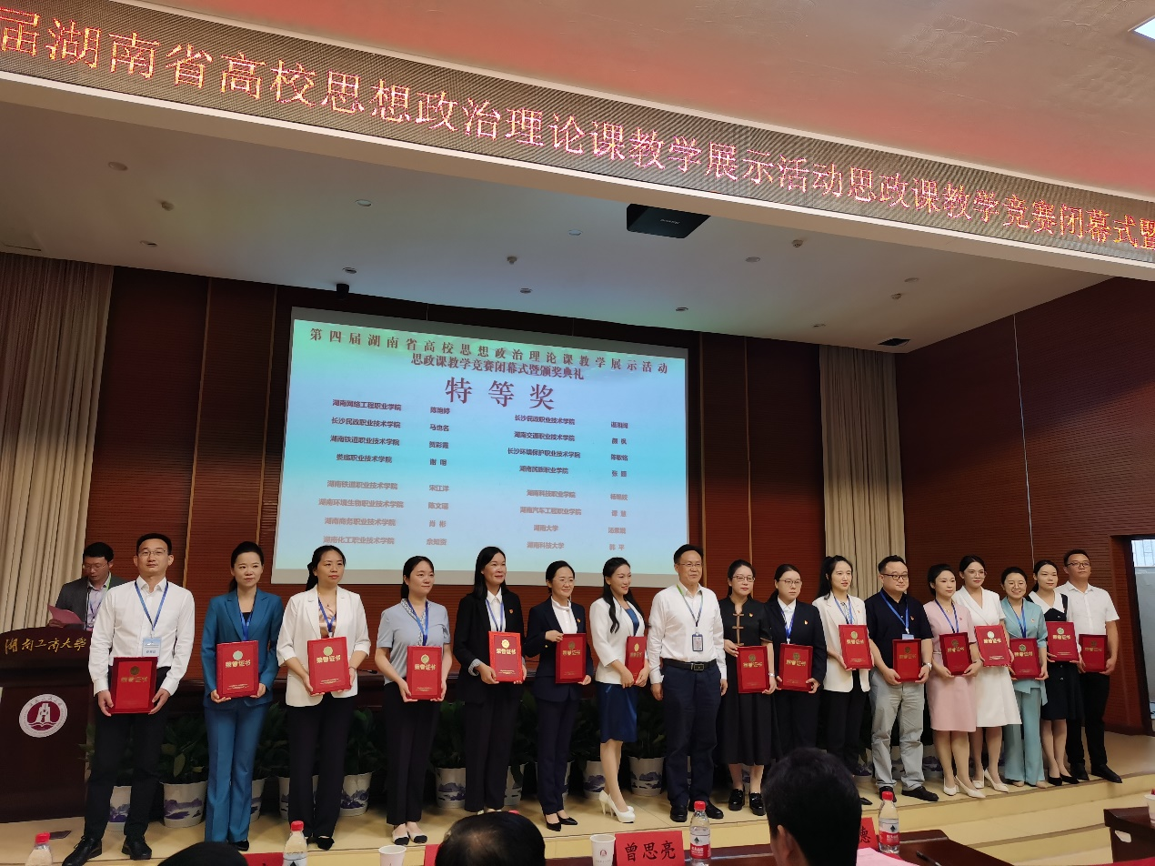 9月23日,第四届全省高校思想政治理论课教学展示竞赛决赛在湖南工商大学落下帷幕,马克思主义学院肖彬老师获得《毛泽东思想和中国特色社会主义理论体系概论》(高职高专组)特等奖,李志平老师获得《习近平新时代中国特色社会主义思想概论》(高职高专组)一等奖。
