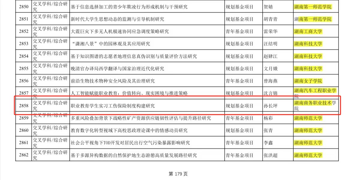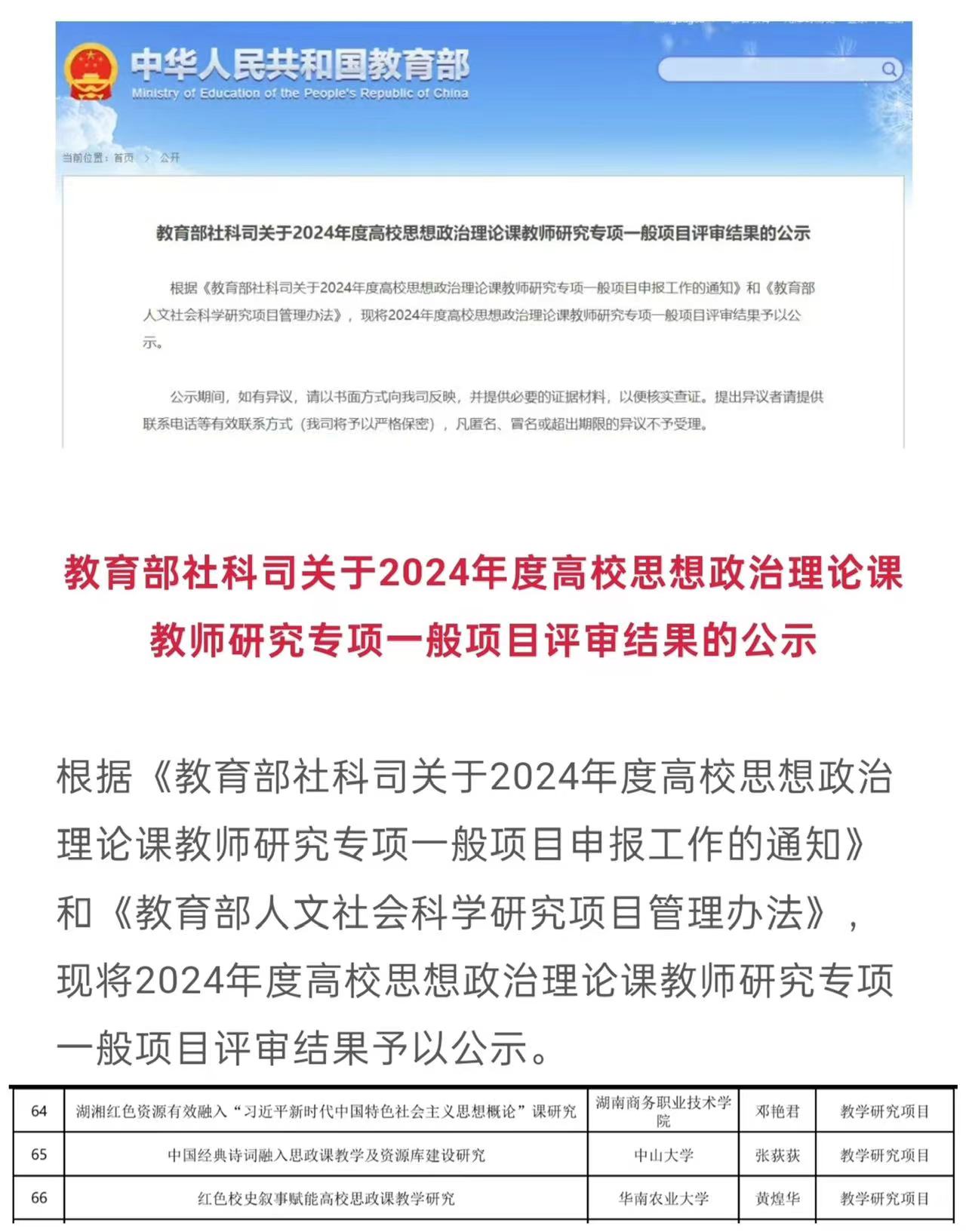 2024年,湖南商务职业技术学院马克思主义学院成功获得两个教育部项目的立项。一是教育部高校思想政治理论课教师研究专项一般项目评审结果公示,邓艳君教授申报的《湖湘红色资源有效融入“习近平新时代中国特色社会主义思想概论”课研究》成功入围;二是教育部人文社会科学研究项目评审结果公示,孙长坪教授申报的《职业教育学生实习工伤保险制度构建研究》成功入围。