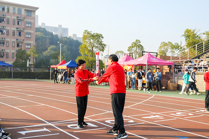紧接着,本次运动会最令人期待 “携手奋进、共创一流”火炬接力仪式正式开始。接力仪式由学院领导、教师代表和学生代表采取跑步传递接力的方式共同完成,共十五个接力点,全程八百米,由党委书记周忠新、院长李定珍、党委副书记廖志刚、副院长廖良林、纪委书记姜华斌、副院长禹明华、副院长易兰华、党委委员聂振华、刘谦、皮卫,学生代表李木剑、青年骨干教师杨小燕、基础课部教师周妮、保卫处处长周旭、会计学院博士李志军共同接力。每一位火炬手高举火炬,将象征着学院70年来的办学积淀与荣誉的火炬以铿锵坚定的步伐传递下去,熊熊燃烧的火炬也寄托着全院师生对于学院美好未来的期望。当李志军在全场的瞩目下接过最后一棒,登上主席台高举火炬之时,点燃了全场运动热情,达到了活动高潮。