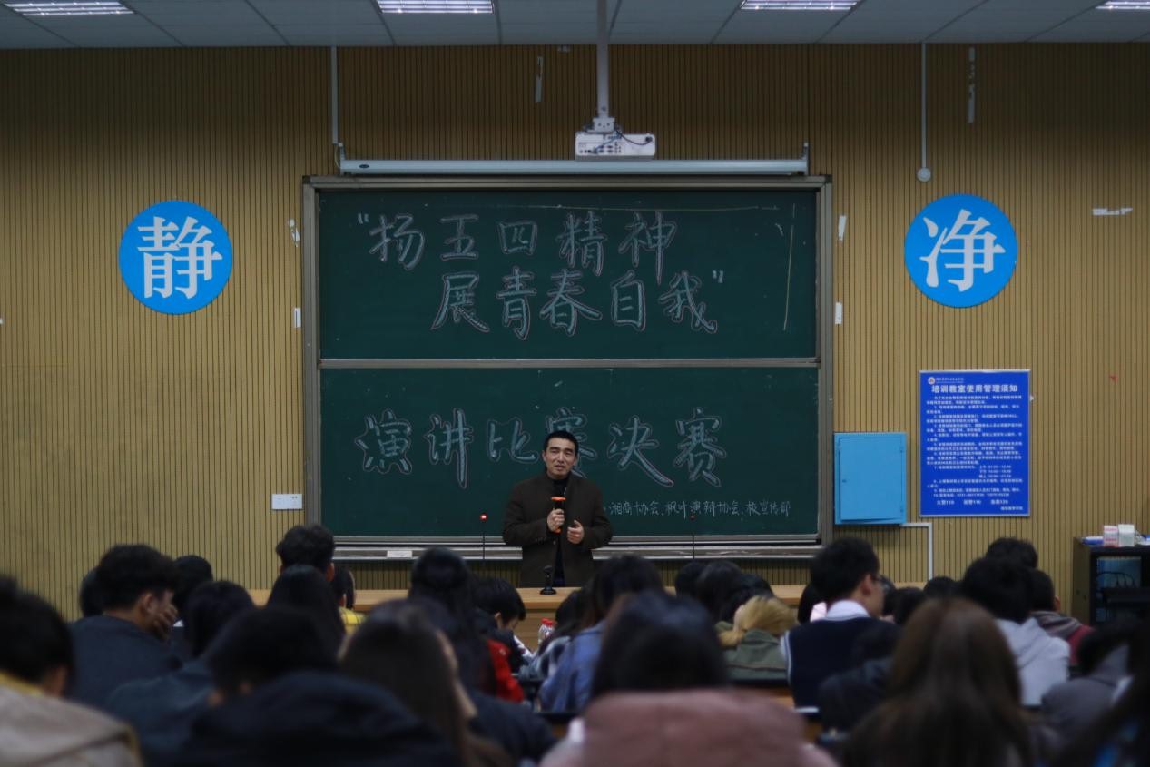 本网讯(通讯员:校宣传部 王萌)4月16日晚7时,枫叶演辩协会与湘商文化践行者协会在一教101举办了“扬五四精神,展青春自我”演讲比赛。校团委书记杨明老师、王娜玲老师、社团联合会主席武超群、校宣传部部长刘福、枫叶演辩协会会长谭倩、湘商协会会长詹怡作为评委出席此次活动。