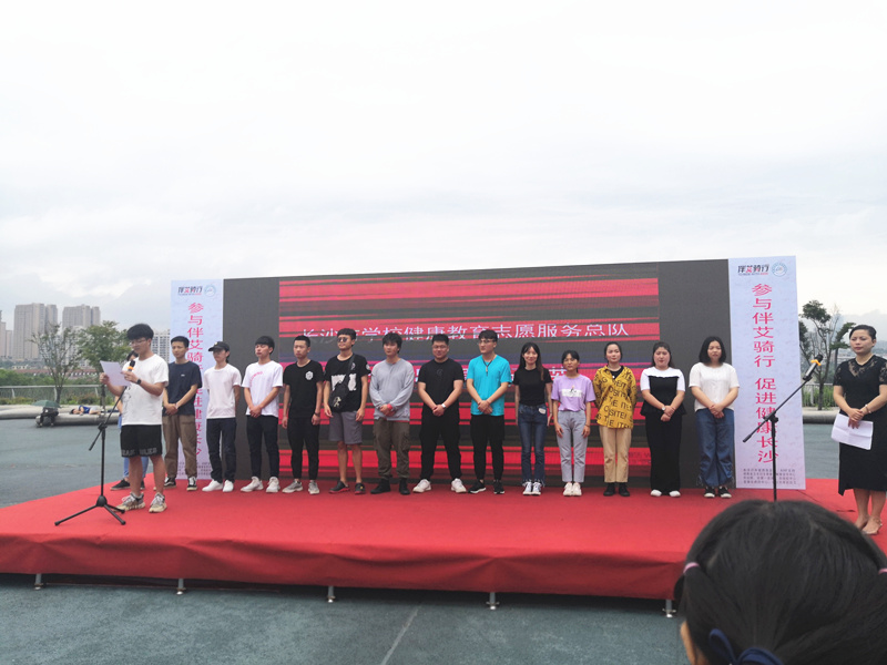 本网讯(通讯员:社联宣传部 柳妍颀)5月26日13:00,校团委安排我校青年志愿者协会组织志愿者参加了由湖南省卫生计生委健康教育宣传中心、长沙市第一医院、长沙市疾控中心、岳麓区疾控中心和长沙市青彩防艾志愿者服务中心等单位共同举办的2019年“伴艾骑行”长沙站公益活动,积极参与防艾宣传工作。