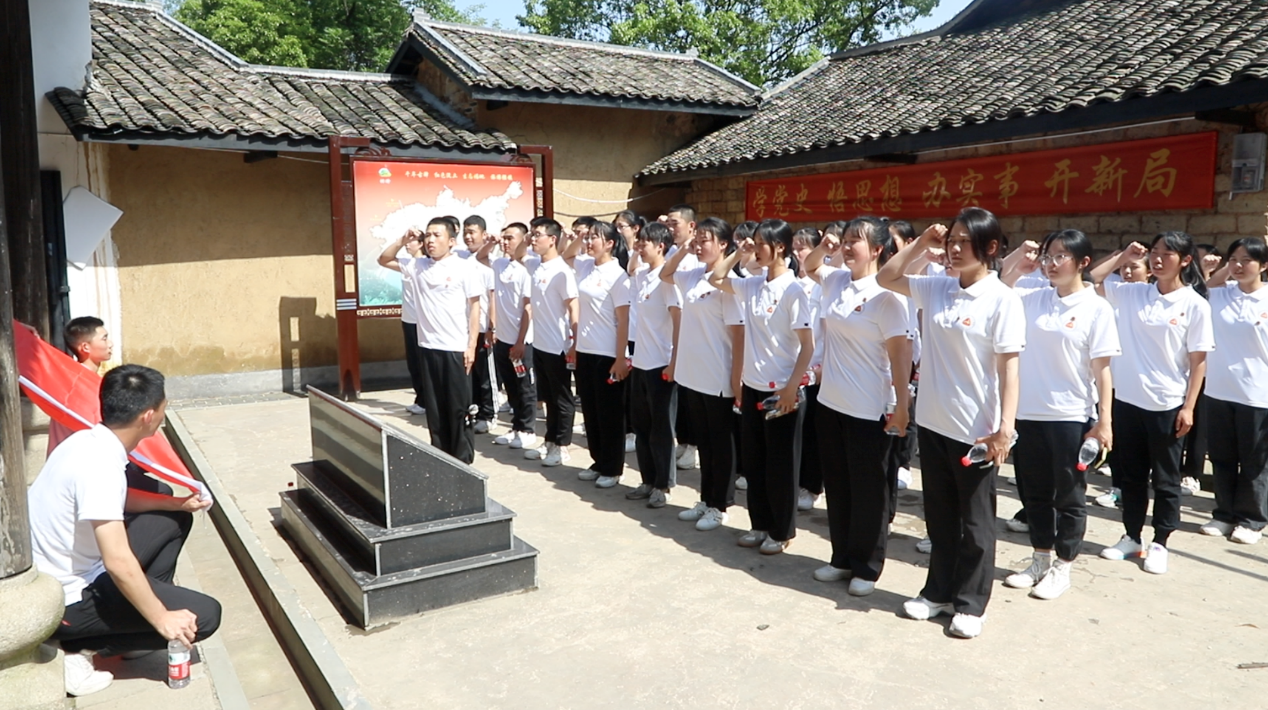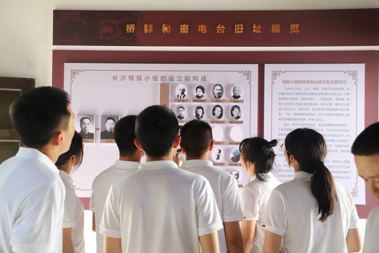 随后师生们到达了湖南和平解放秘密电台工作站旧址,它是一座四合院建筑,位于长沙市望城区桥驿镇洪家村付家组,是湖南和平起义时中共与国民党湖南当局联络所设置的秘密电台。后山有个防空洞是为躲避日军入侵而修建,湖南和平解放秘密电台在紧急情况下就藏匿于此,洞口直立约一人高,洞长3米,周围树木繁茂,位置十分隐蔽,不易发现。湖南和平解放秘密电台旧址对研究湖南和平解放具有重要的历史价值,商务职院的师生们在这里重温了庄严的入团宣誓,铿锵有力的誓言响彻全场。