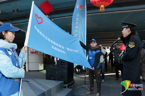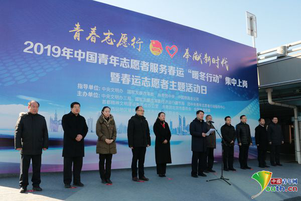 当天上午,2019年中国青年志愿者服务春运“暖冬行动”集中上岗暨春运志愿者主题活动日在北京西站举行,来自铁路、公交、地铁、西站地区和机关、企业等单位的140多名春运志愿者在这里激扬宣誓,统一上岗。