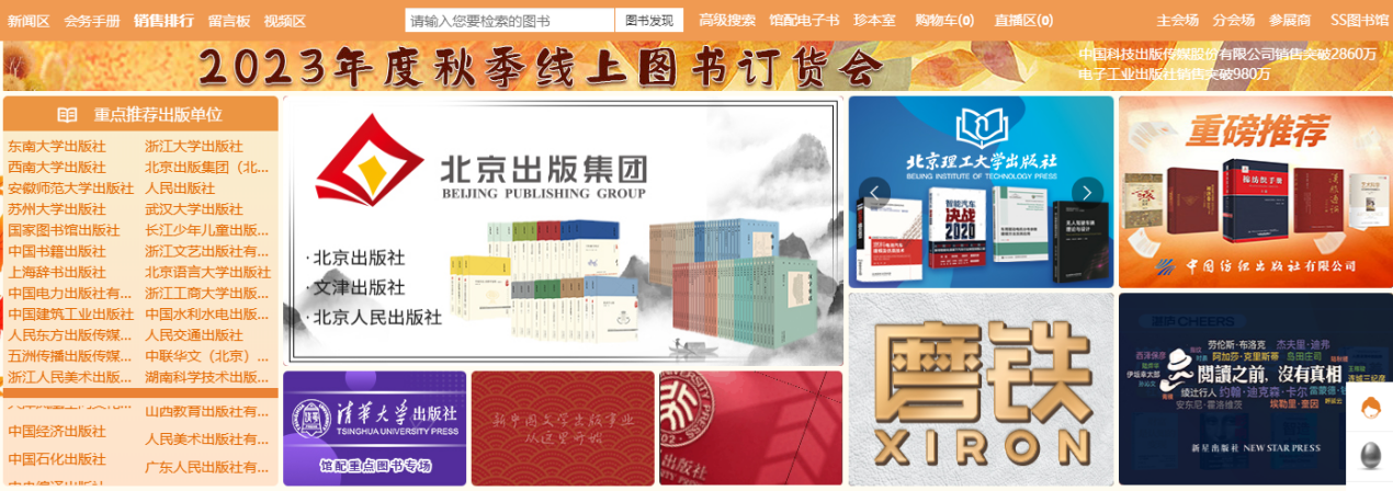 1. 主会?。?/strong>其右上角展示图书采会开幕式领导讲话及平台消息发布。其他板块主要展示重点出版社书目,直接点击出版社名称即可进入选书界面。