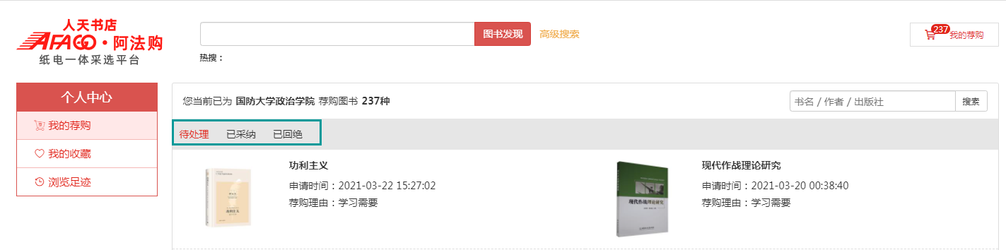 4. 我的荐购:【个人中心】→【我的荐购】 中可查看到所有的荐购书目,及图书馆的采纳情况。