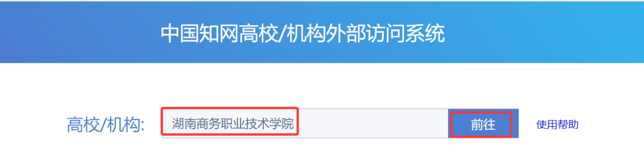 2.进入中国知网高校/机构外部访问系统,在“高校/机构”栏,填写“湖南商务职业技术学院”,点击“前往”。