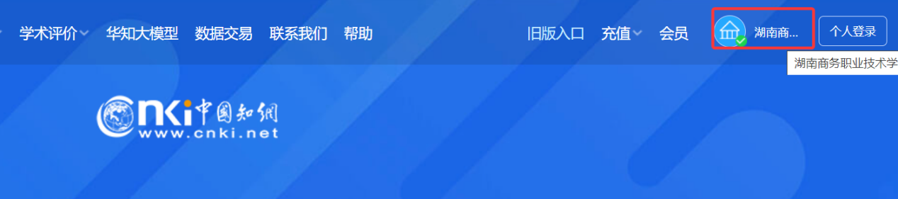 4.跳转至“中国知网”页面,右上角会显示机构“湖南商务职业技术学院”,登录成功即可访问图书馆订购的