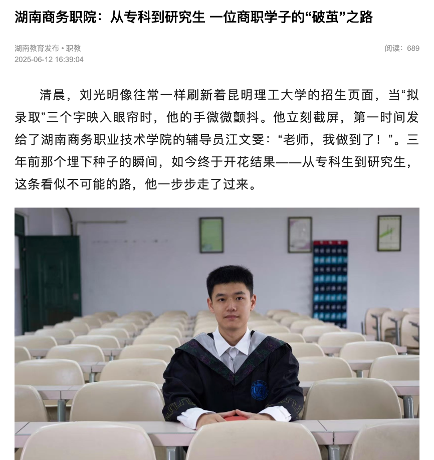 湖南教育发报道——湖南商务职院:从专科到研究生 一位商职学子的“破茧”之路