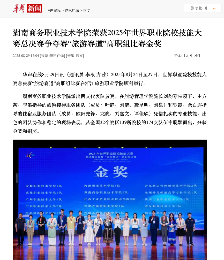 华声在线报道——湖南商务职业技术学院荣获2025年世界职业院校技能大赛总决赛争夺赛“旅游赛道”高职组比赛金奖