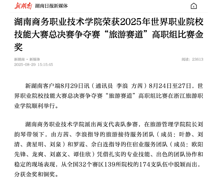 新湖南报道——湖南商务职业技术学院荣获2025年世界职业院校技能大赛总决赛争夺赛“旅游赛道”高职组比赛金奖