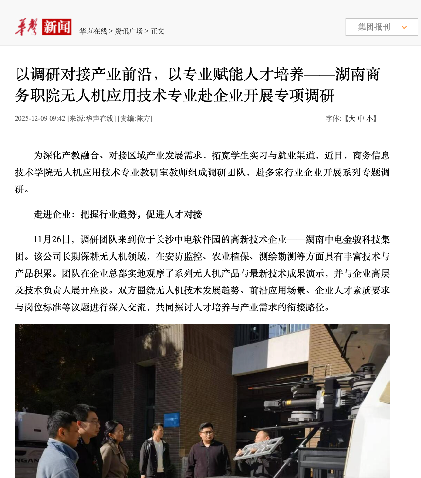 华声在线报道——以调研对接产业前沿,以专业赋能人才培养——湖南商务职院无人机应用技术专业赴企业开展专项调研