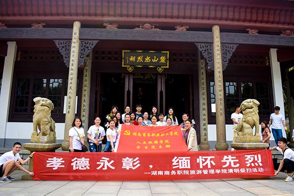 孝德永彰,清明祭扫各纷然。为进一步继承和发扬中华民族传统“孝文化”,引导大学生弘扬爱国主义精神,2018年4月3日,旅游管理学院特在岳麓山抗战文化园举办清明节祭扫活动,望借祭扫之际回顾历史、重温历史,了解革命烈士的英雄事迹,以此增强青年学子的爱国情怀与新时代使命感。在旅游管理学院党总支副书记黄铖同志的统筹部署下,学生党支部书记欧阳序华、教师代表吴丹、徐薇,主席团成员、预备党员及部分学生代表全程参与此次活动。