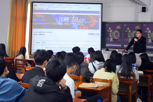创意分享会一开始,主持人高宏华先通过演示幻灯片,简略介绍了大广赛的含义以及本届大广赛的命题,然后向大家具体分享了在“湖南大广赛启动仪式”中的那些精彩演讲内容:有刘瑞武教授、刘铁男、吴孟生、邓木荣、杨海标先生等人的演讲。随后,参与过“湖南大广赛启动仪式”的17电技1班李毅豪、17电技2班李陆明和16艺术2班肖晶等3位同学也分别讲述了自己对大广赛的看法,与大家一起分享自己的心得体会。