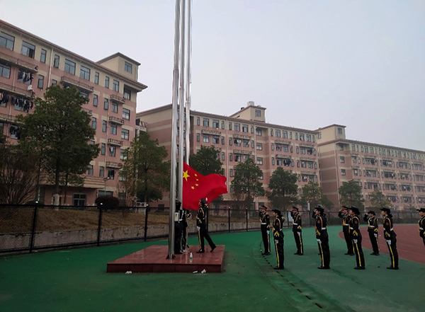 “升旗仪式现在开始”,国旗班迈着强劲有力的步伐向升旗台走去,“起来,不愿做奴隶的人们…”庄严的国歌响起,全体肃立,旗手扬起鲜红的五星红旗,五星红旗在全体师生的注目下缓缓升起,迎风飘扬。